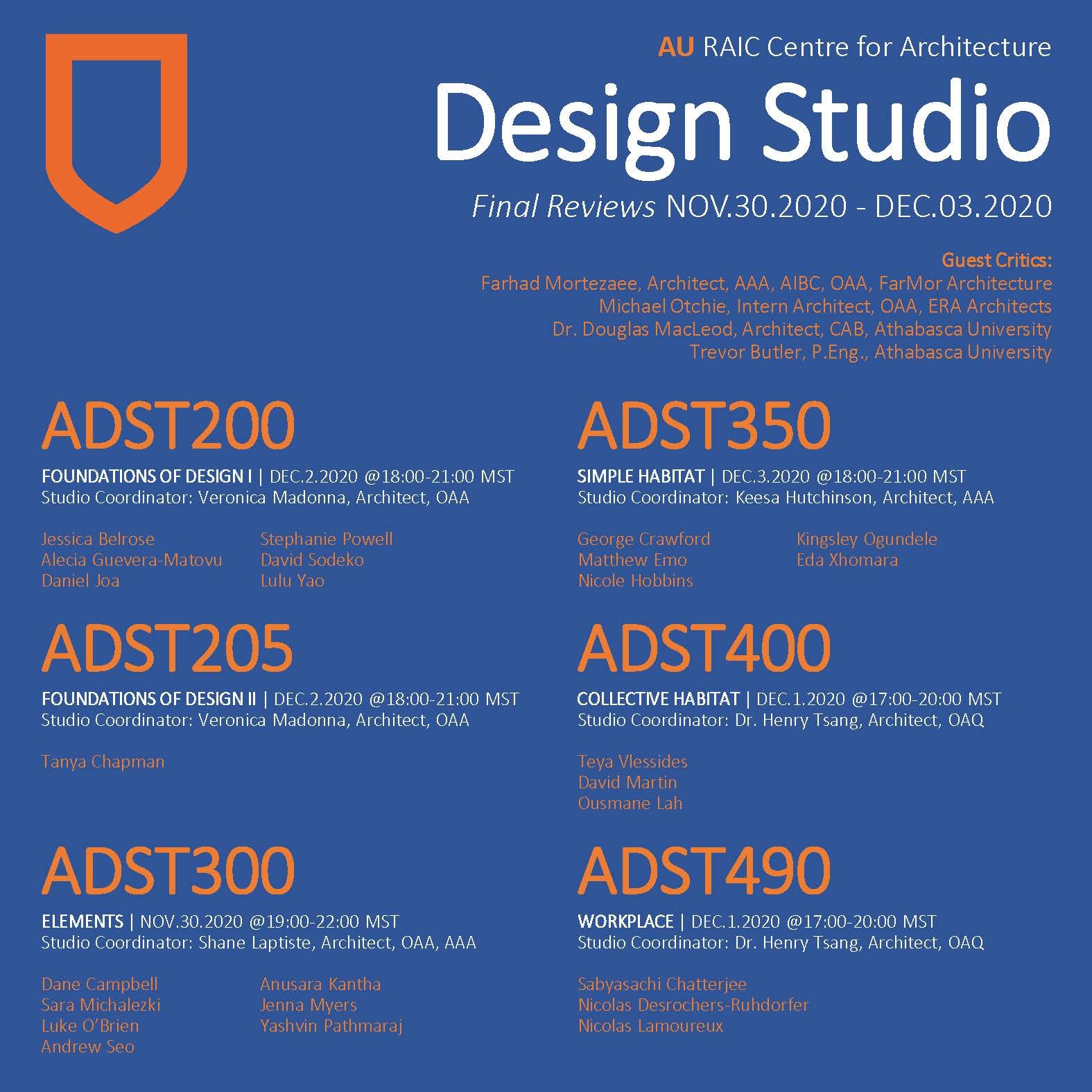 Design studios’ final reviews are happening this week! We have a great lineup of guest critics, and students are all geared up for a packed week of design project presentations. All AU architecture students are welcome to attend. Best of luck to all!