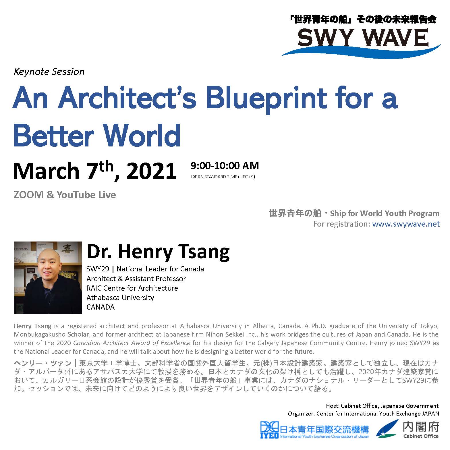 Henry is a registered architect and assistant professor at Athabasca University in Alberta, Canada. A Ph.D. graduate of The University of Tokyo / UTokyo, Monbukagakusho Scholar, and former architect at Japanese firm Nihon Sekkei Inc., his work bridges the cultures of Japan and Canada. He is the winner of the 2020 @canadianarchitect Award of Excellence for his design for the Calgary Japanese Culture Centre. Henry joined SWY29 as the National Leader for Canada, and he will talk about how he is designing a better world for the future.